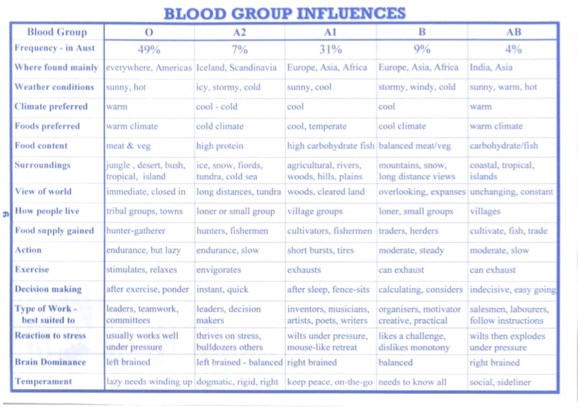 Food groups can be classified as warm- or cool- climate foods. Blood group O and A1B are warm climate blood groups. A1, A2, B and A2B are cold climate blood groups. The others are mixed.